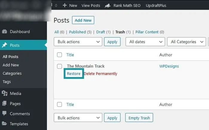 Simply go to Dashboard > Posts to restore a trashed post. Then, above the list of posts, you will get the trash option. Press on the trash tab, then the restores choice would then appear. Choose which post you want to restore and then click on restore. The post will be restored. However, if you have previously deleted the post permanently from this location, you will not be able to restore it.