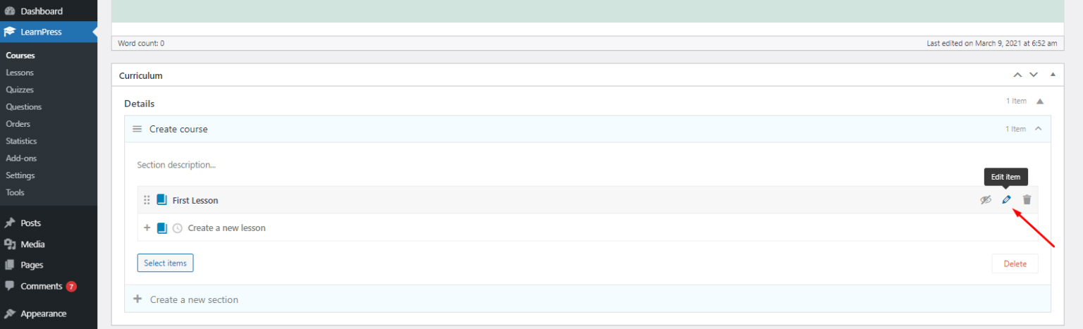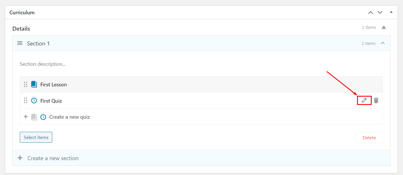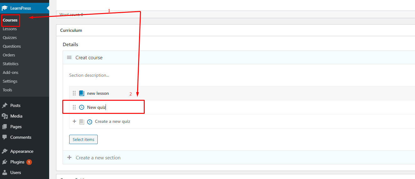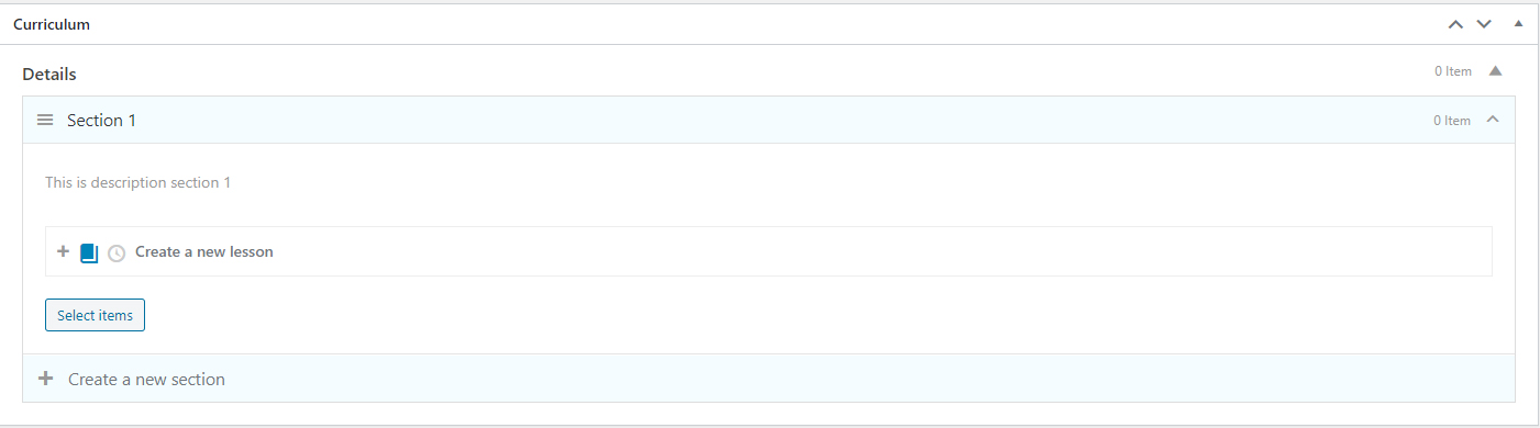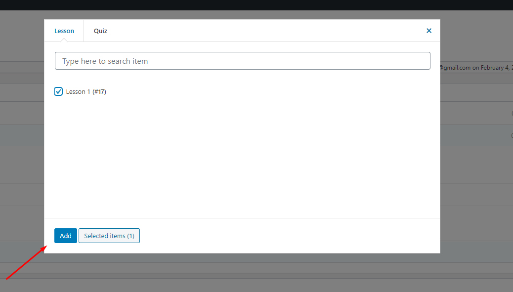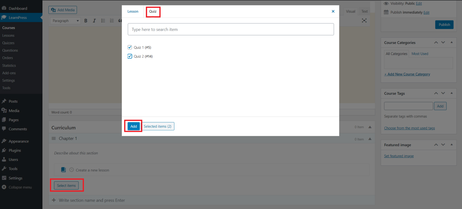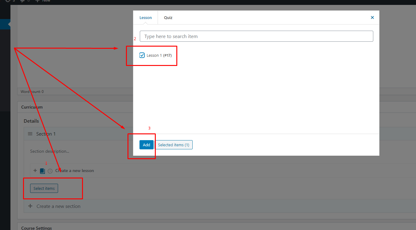 You can click on the “Select items” button to select the items (lessons, quizzes) you want to add to the course. Please note that you only can add the course items that have not been assigned to any course.