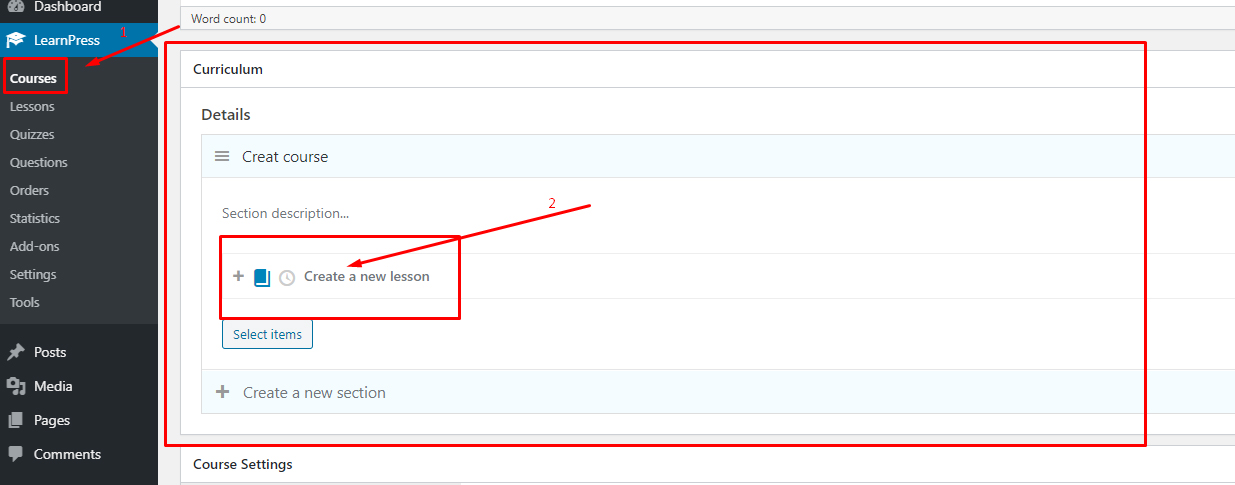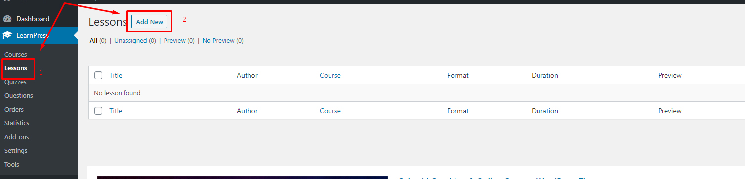 Way 2: Please go to Dashboard => Learnpress => Lessons => Add new. You can see the below image: