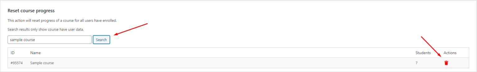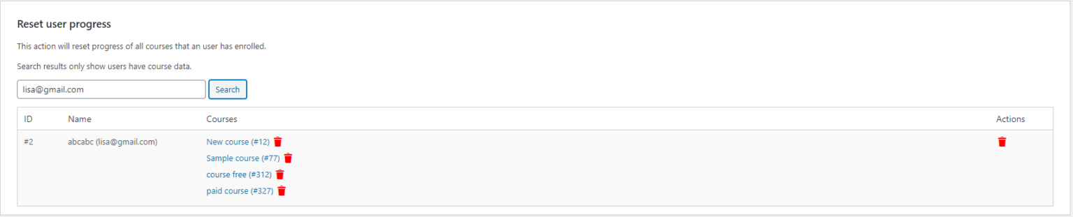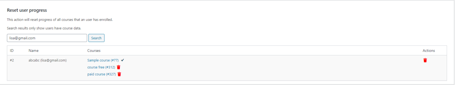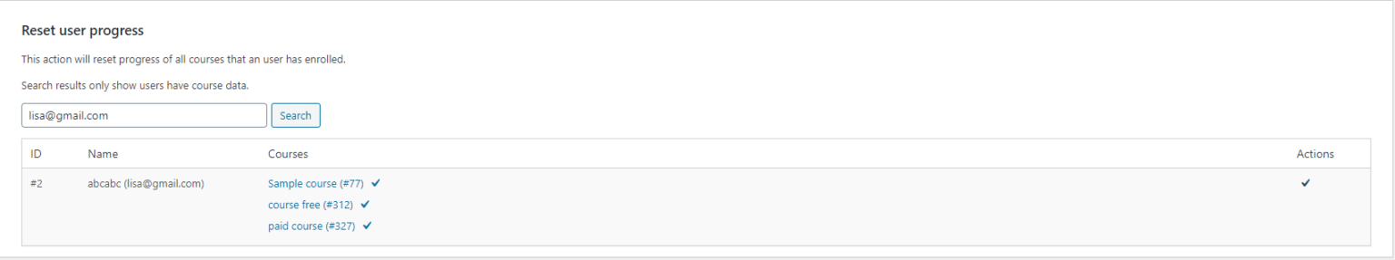 - Reset user progress: This action will reset the progress of all courses that a user has enrolled in.
