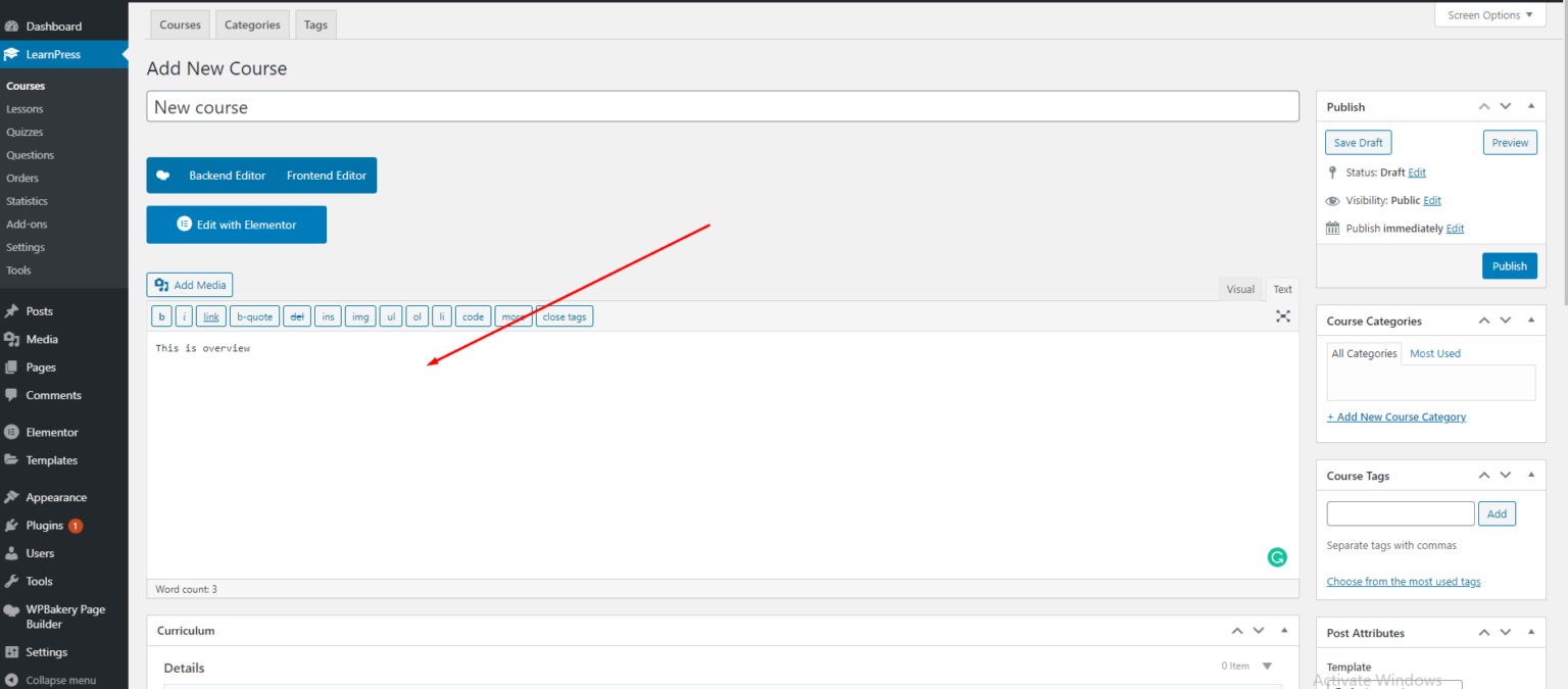 In the Course Overview section, you can set the name and description for the course, what you wrote will be displayed in the Overview tab on the single course page.
