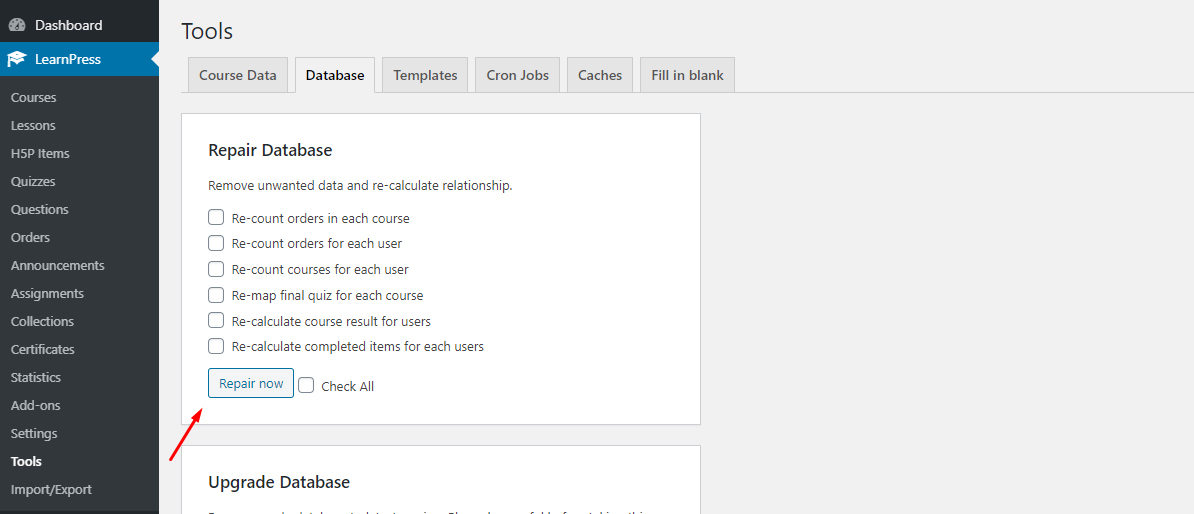 Please go to Dashboard => Learnpress => Tools => Database => Repair Database => Check box you want => Repair now. You can see the below image: