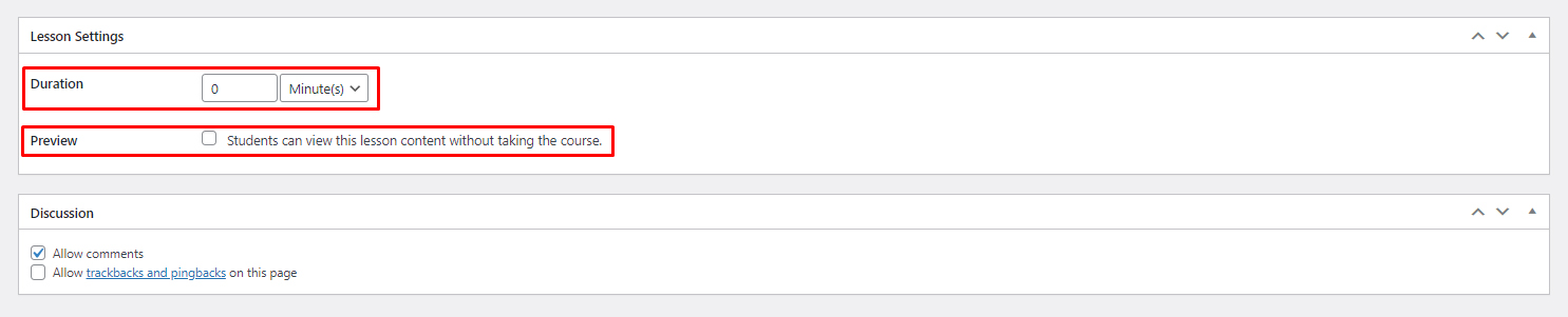 You can set the duration for a lesson, allowing customers to preview the lesson content before buying or allow users to add comments in that lesson.