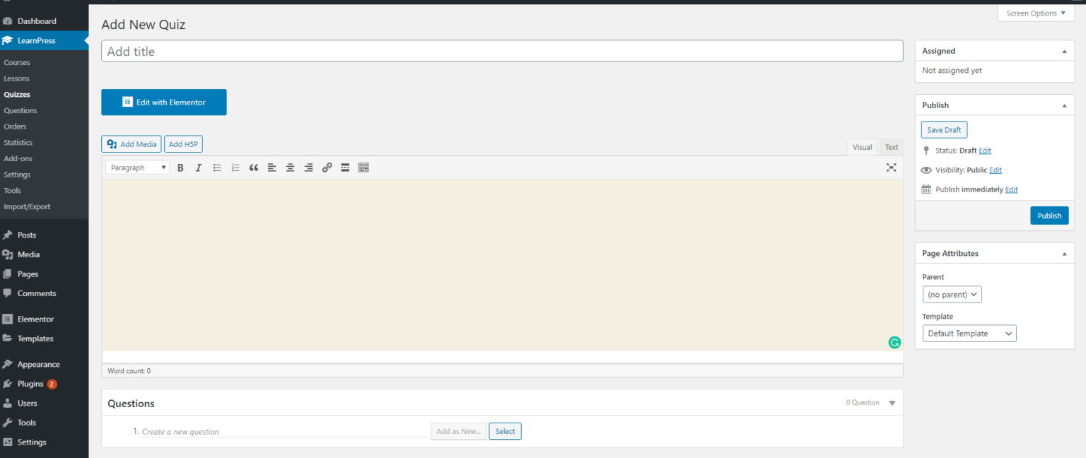 On the quiz creation page, there are three main sections: