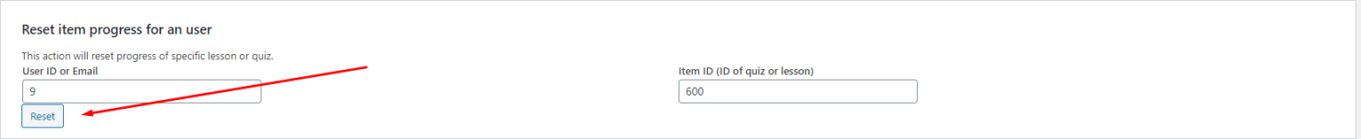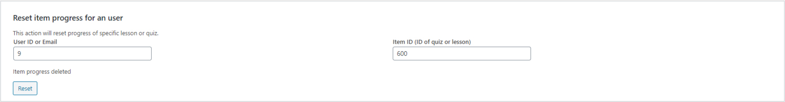 - Reset item progress for a user: This action will reset the progress of a specific lesson or quiz