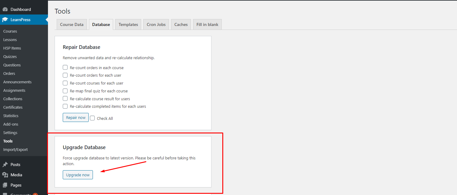 Please go to Dashboard => Learnpress => Tools => Database => Upgrade Database => Upgrade now. You can see the below image: