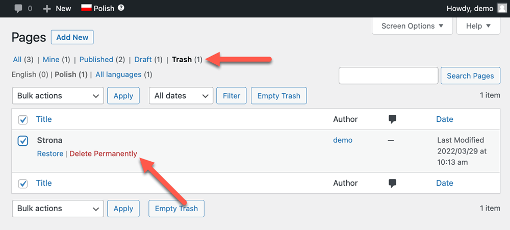 - Click on Trash and locate the page you just deleted. Click on Delete Permanently.