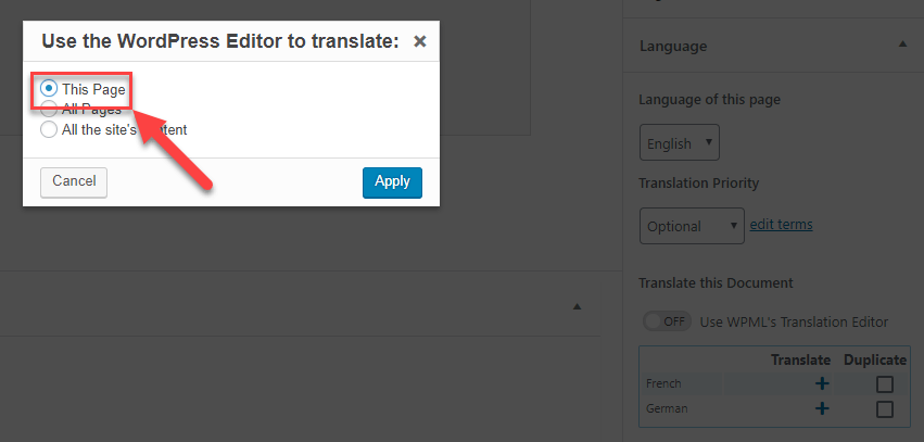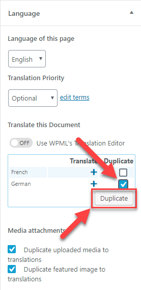 - In the Language meta box, select the Duplicate checkbox, and then click Duplicate. This will duplicate the page in the selected secondary language.
