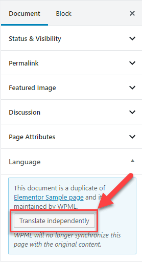 - When editing the duplicated page, click Translate independently in the Language box. This unsyncs the secondary language page so your design or translations won’t be overwritten when you update the default language page.