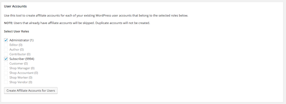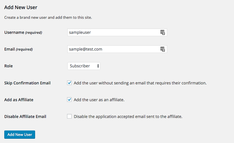 Note: The Add as Affiliate and Disable Affiliate Email checkboxes will only show when you check the Skip Confirmation Email box, and if you do not have Auto Register New Users enabled in Affiliates → Settings → Misc. If you have the Auto Register New Users setting enabled, the affiliate account will be automatically created when you create the new user account.