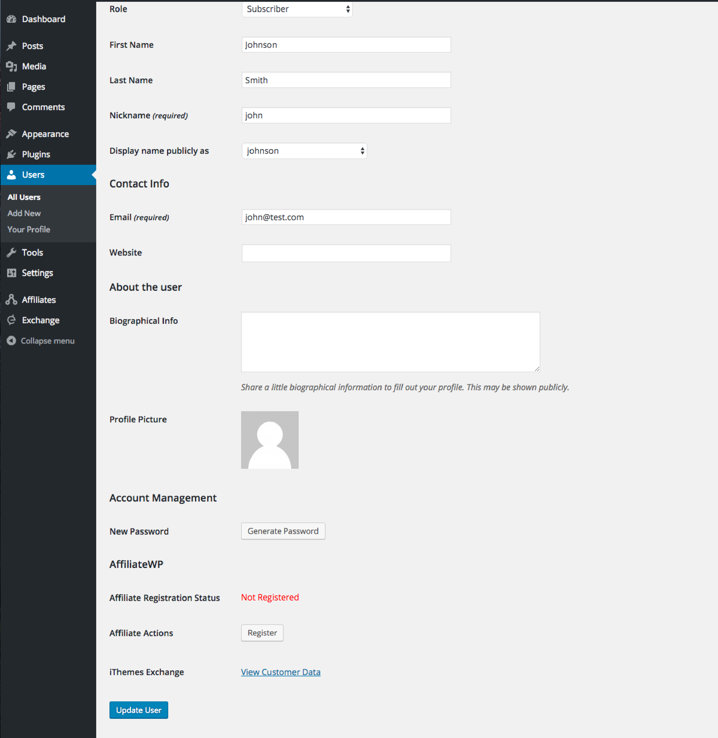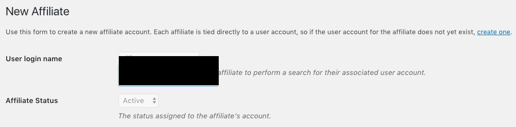 If the affiliate that you are creating an account for does not already have a WordPress user account on your site, first go to Users → Add New and create the user account. Once the user account is created, the user can be registered as an affiliate.