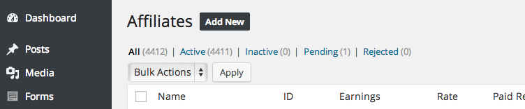 To register an existing user account as an affiliate, go to Affiliates → Affiliates and click the Add New button at the top of the screen: