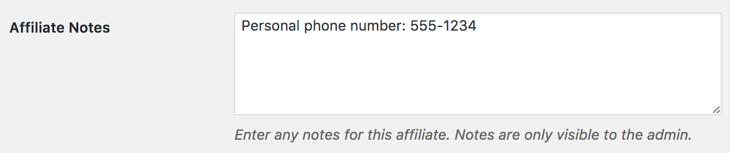To add a note for an affiliate, go to the Affiliates → Affiliates screen, and click edit for the desired affiliate. At the bottom of the affiliate’s account screen, enter notes in the Affiliate Notes field: