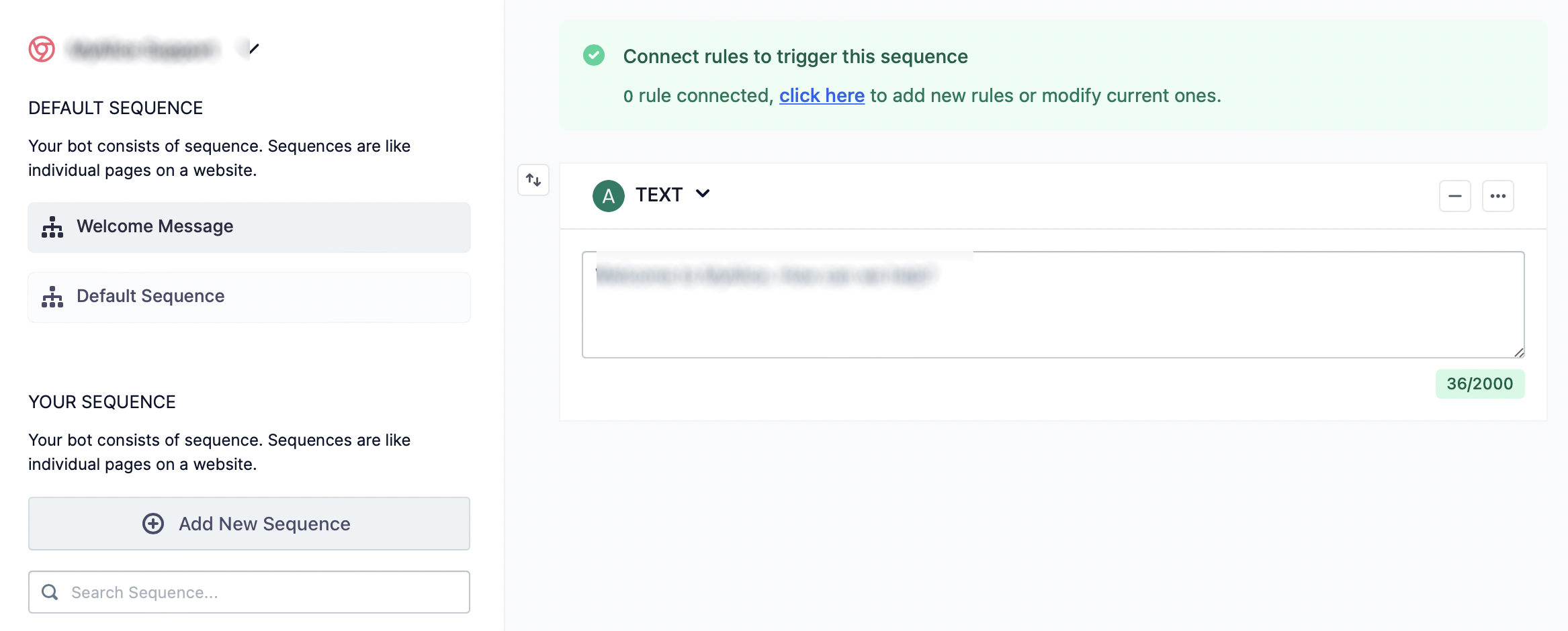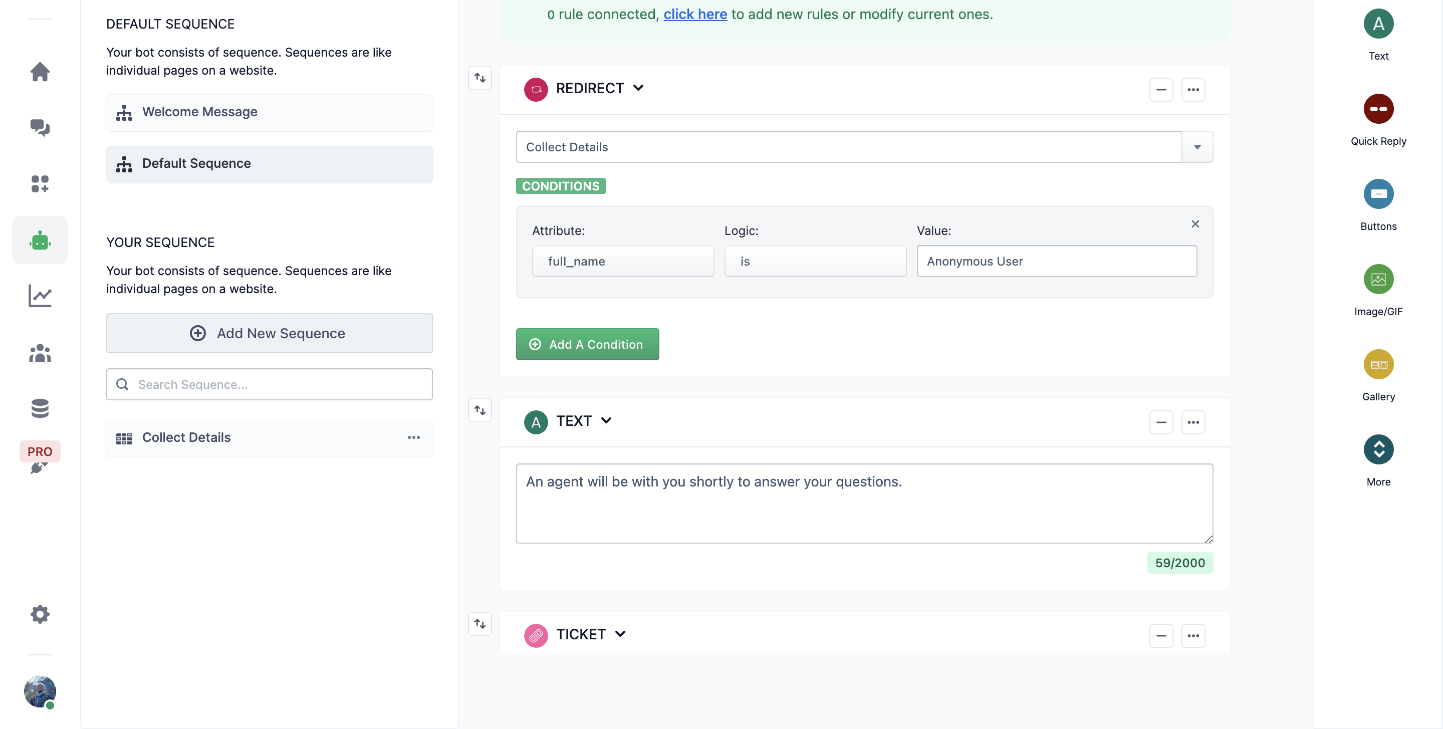 1. Add a Redirect Block at the start of the Default Sequence and add a condition that will check their name, which will be ‘Anonymous User’ for any first time user, and navigate accordingly. Since the blocks in a sequence in a if/else manner, add a Text Block and Ticket Block after the Redirect Block so that you can connect with people who have completed this flow already.