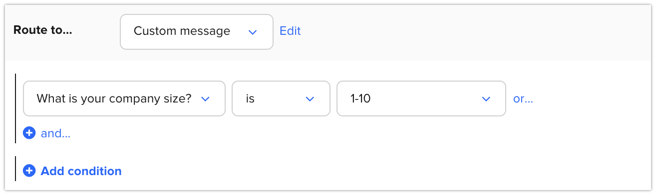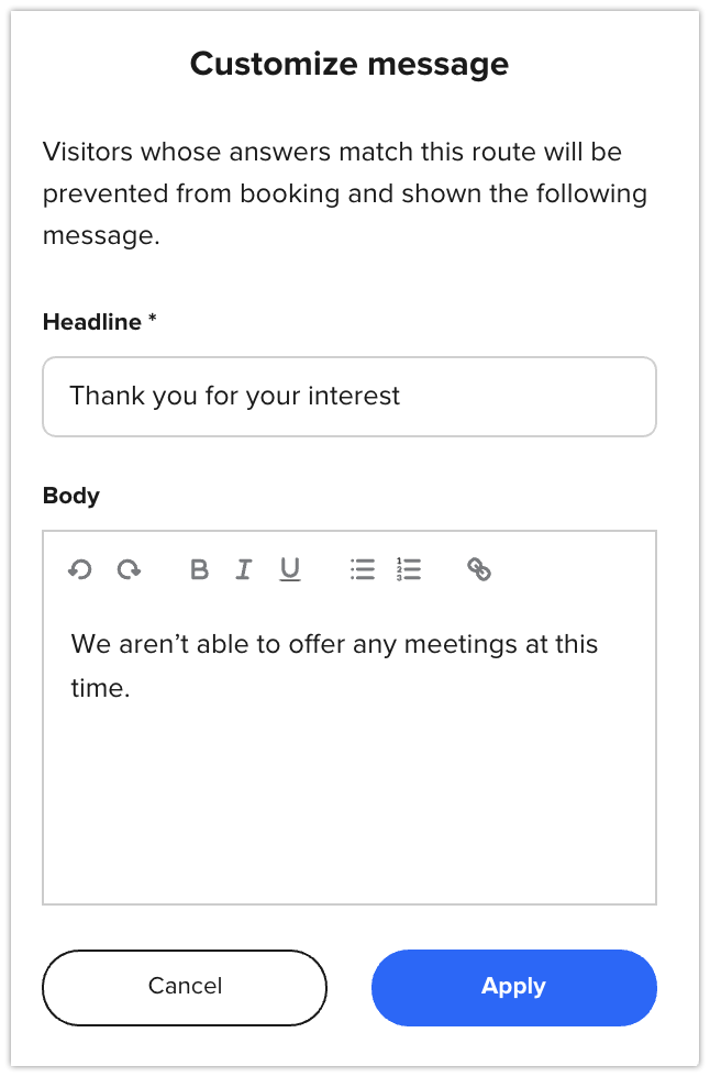 Example: If a visitor’s company size is between 1-10 employees, they cannot book with you and will instead be routed to a custom message.