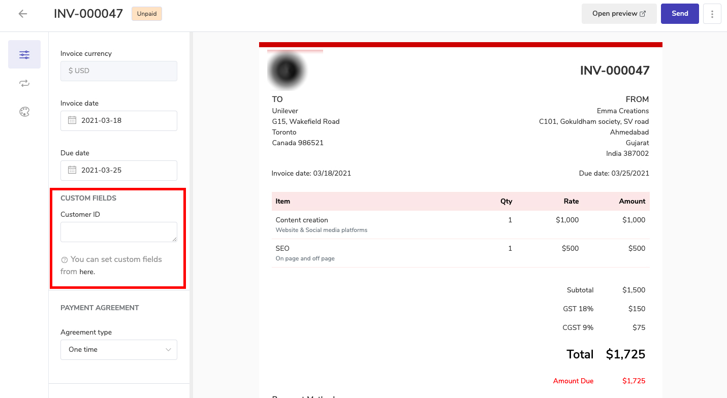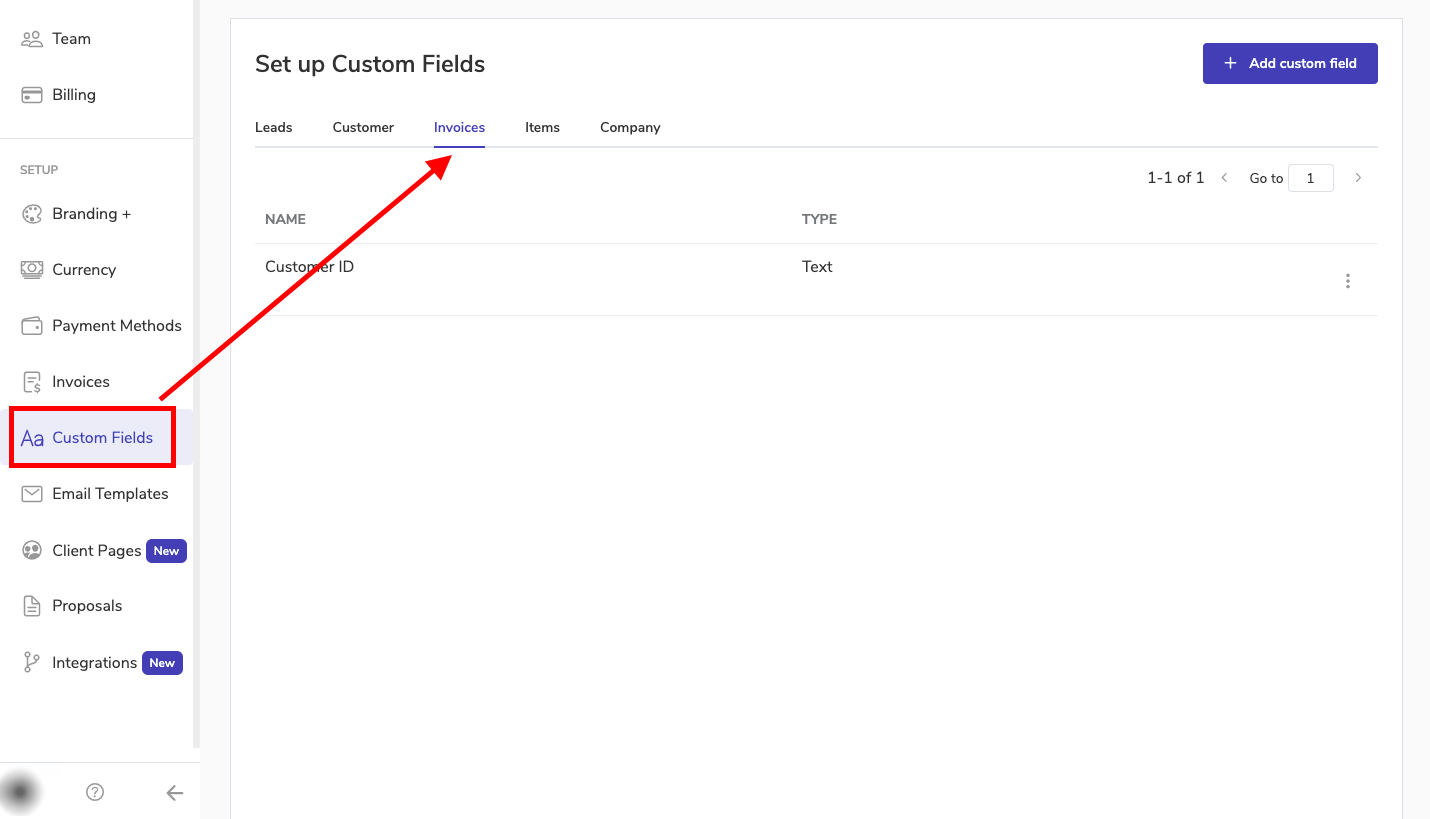 • You can also add additional fields that you want to show on your invoice by adding them in Custom field.