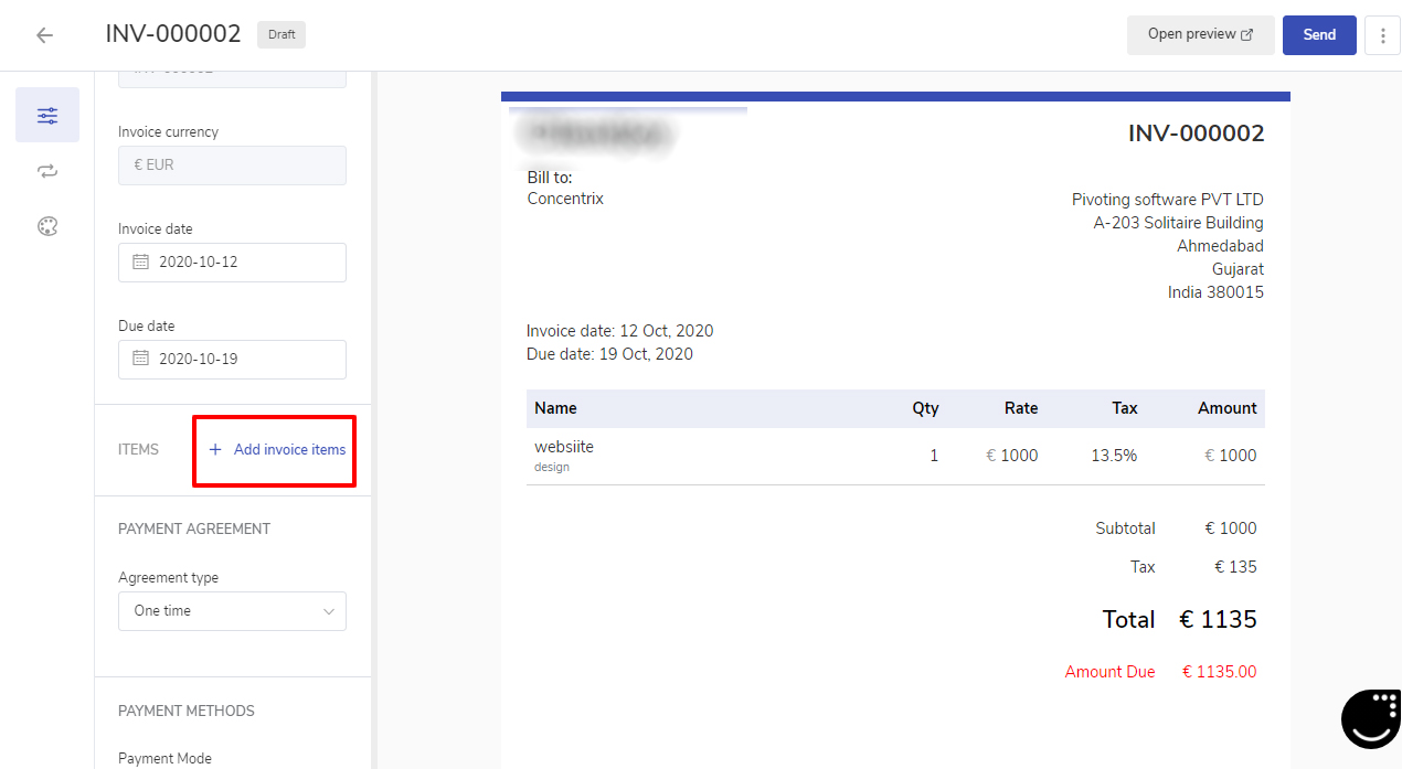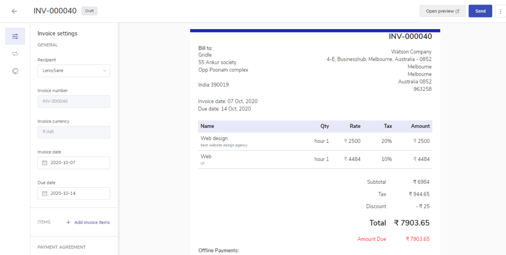 • You’ll see the item table inserted in your Invoice. You can also check how the Invoice will look to your customer by clicking the Open Preview button.