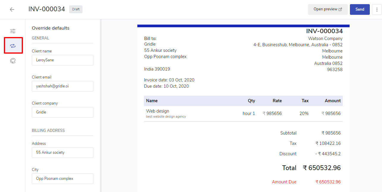 • You’ll land on the Invoice editor page which has all details about your new Invoice.