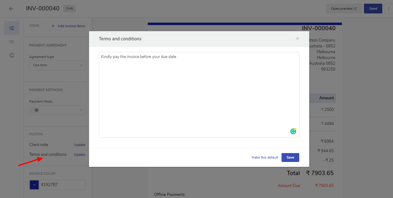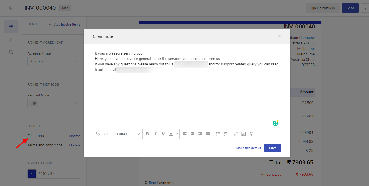 Under invoice settings, there is a section Footer where you Can define the client note for the client for whom you are creating the invoice, and in Payment terms, you can update the terms and conditions related to payment.