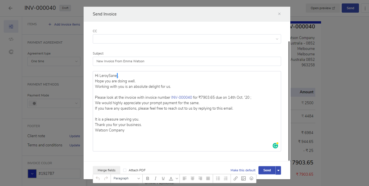 • It will open the Dialog box with a pre-filled email template for sending an Invoice to the customer. You can make changes to the email by changing text or styling (bold, italic, etc.) the way you need.