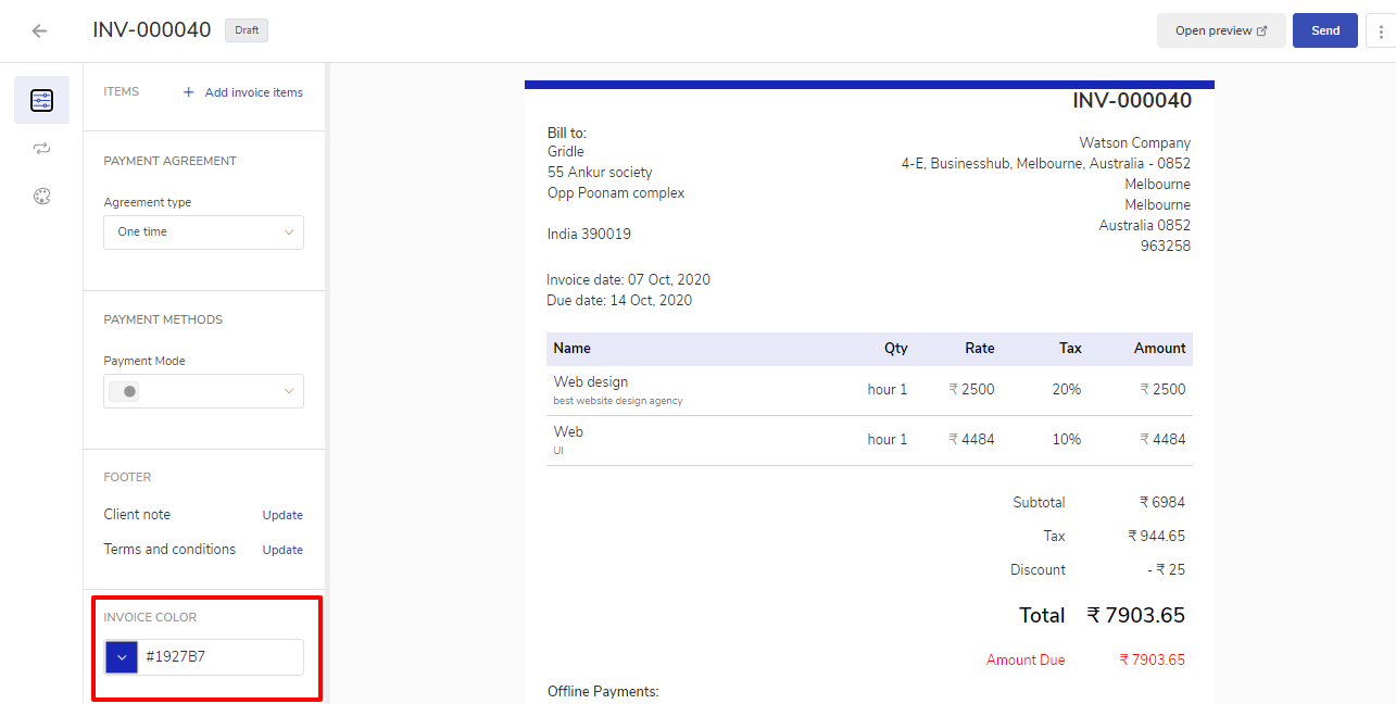 • You can choose the color for your Invoice. By default the brand color defined in the Workspace Settings is used.