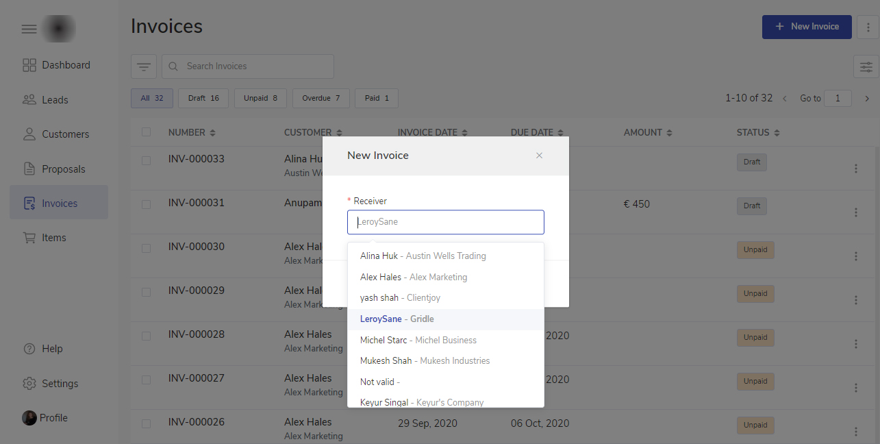 • A modal will open for New Invoice. You need to type the receiver name and click on Create button to create a new invoice.
