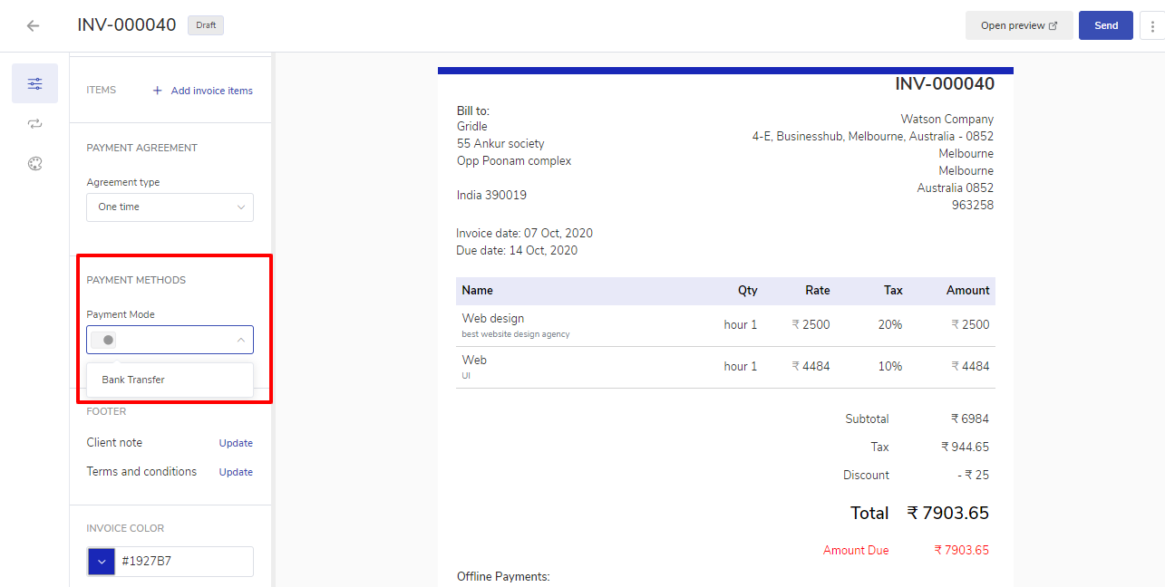Note: Offline Payment method is automatically inserted into Invoice Document.
