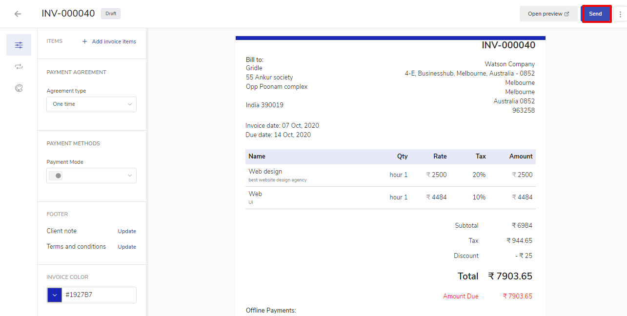 • Once you’re done with creating the Invoice. You can send the Invoice to your customer by clicking the Send button.