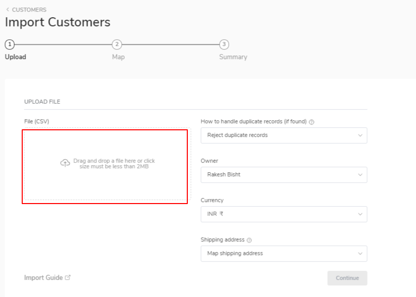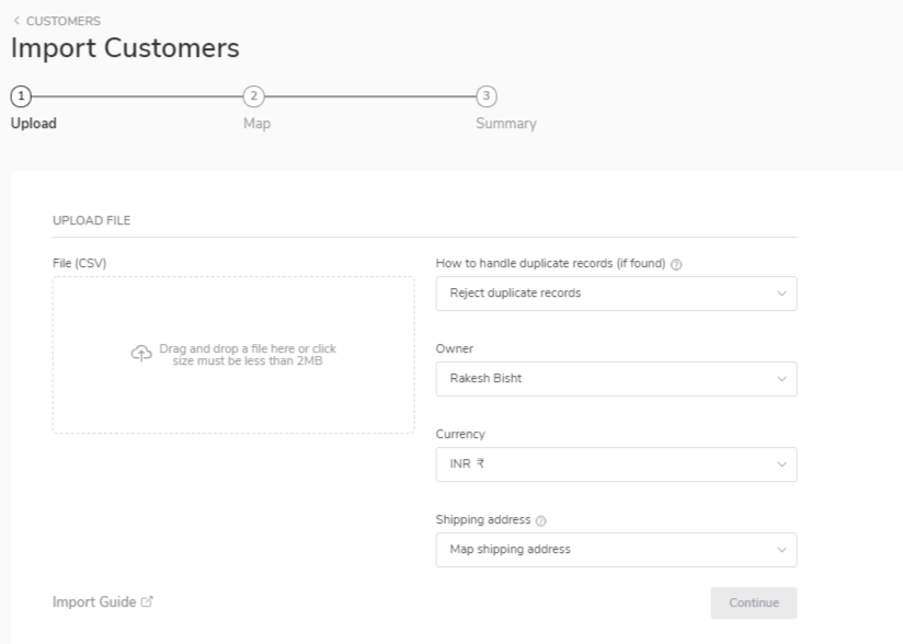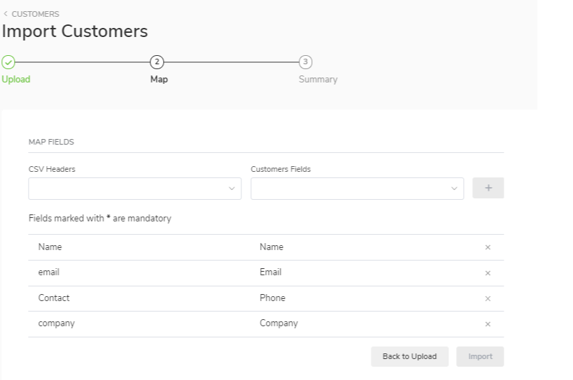 If you have additional Customer information then first add Custom fields and then begin the import. You’ll be asked to map the custom fields with your column headers.