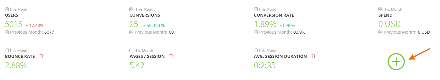 To add new KPI tiles to your funnel dashboard, click on the + icon on the KPI section at the top of your funnel dashboard. You can add any tracked actions or metrics like Bounce Rate, Average Session Duration, Number of Sessions per Visitor, among others.