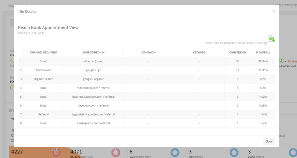 You can click on your KPI tile to view more details such as the number of conversion for each acquisition channels