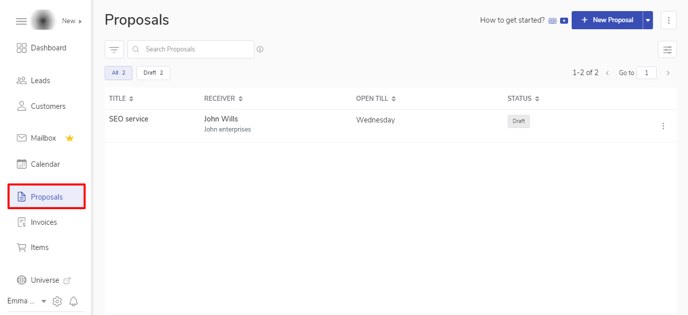 Click on the dropdown option beside + New Proposal and click on Upload Proposal.