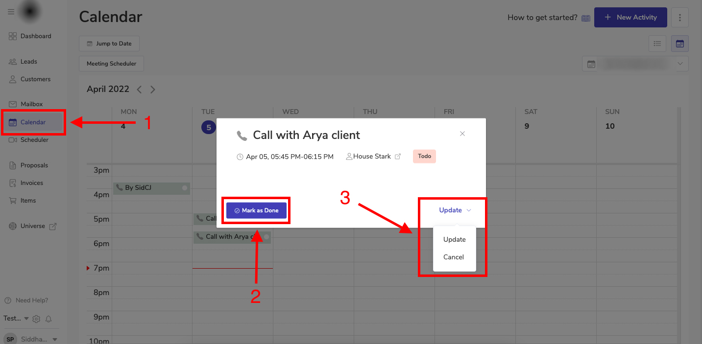 2. How to update/edit, Mark as Done, and Cancel created Call/Meeting?