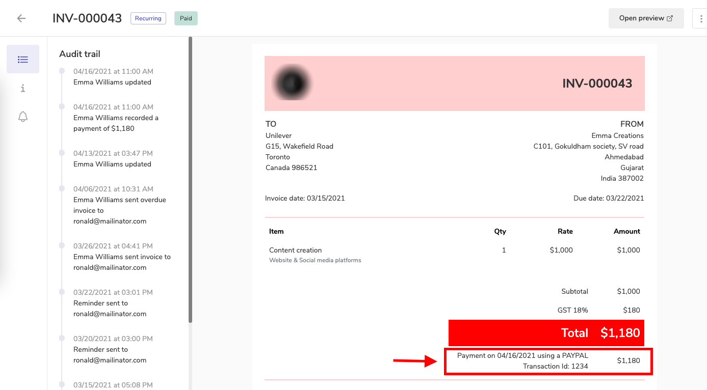 Click on the invoice whose audit trial you want to check.