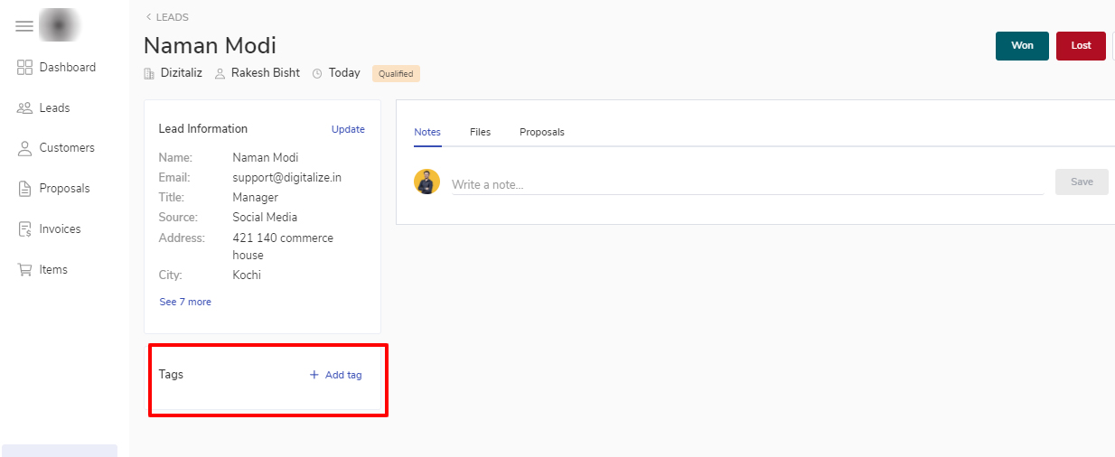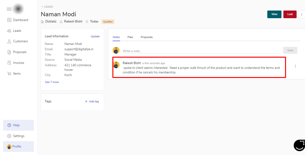 With popCRM under the lead contact section, you can save notes which can be some important points of your last conversation that you want to refer to in the future.