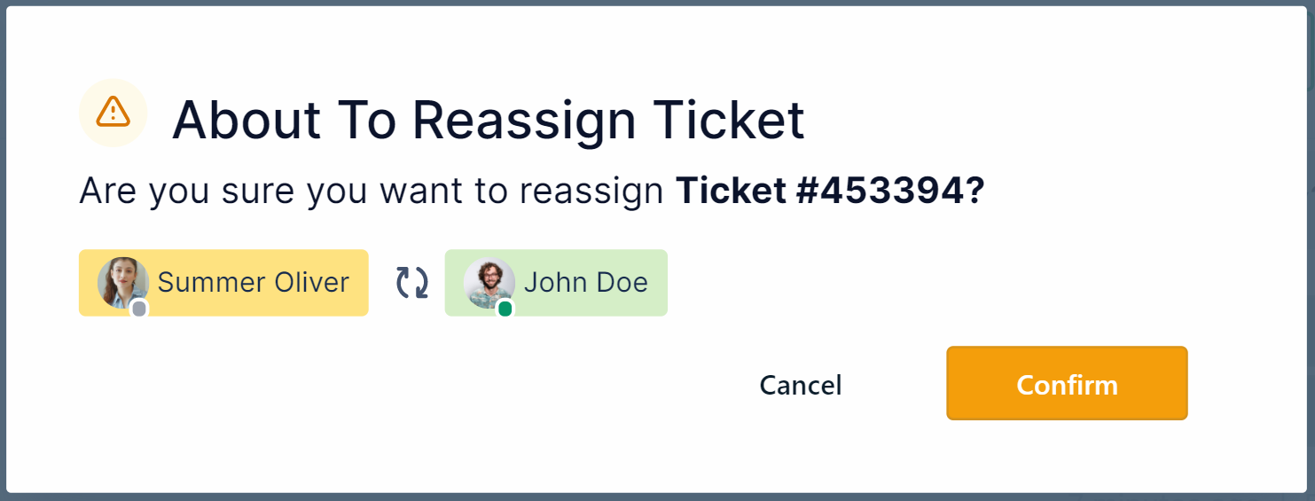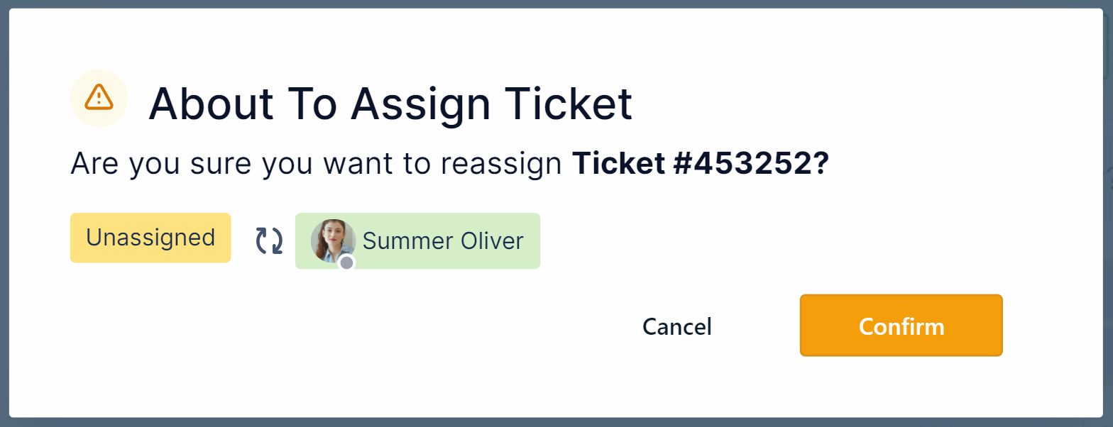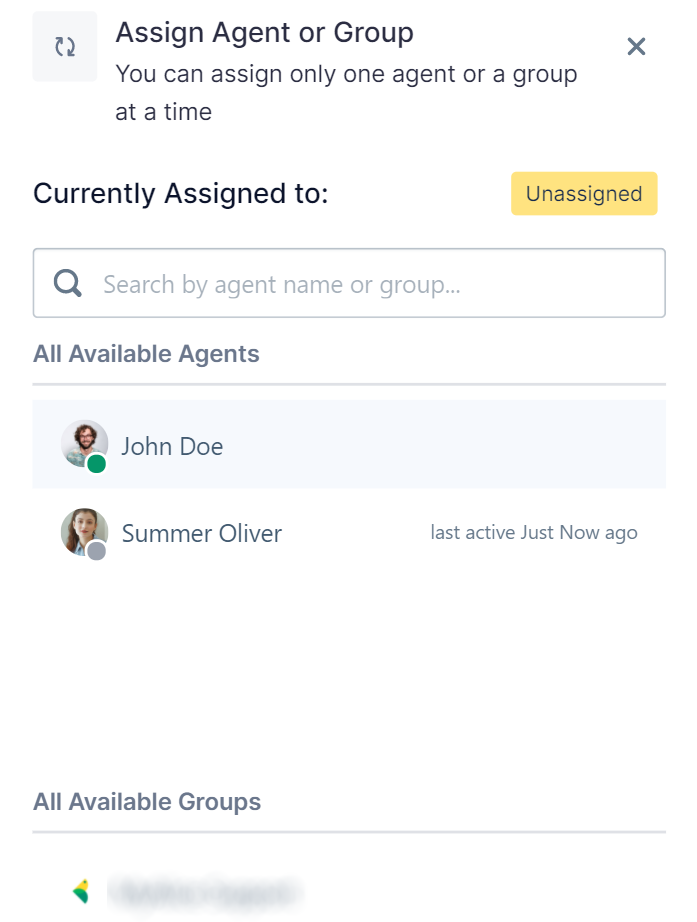 3. Choose the desired agent/group from the search results, and select Confirm to assign the ticket accordingly.