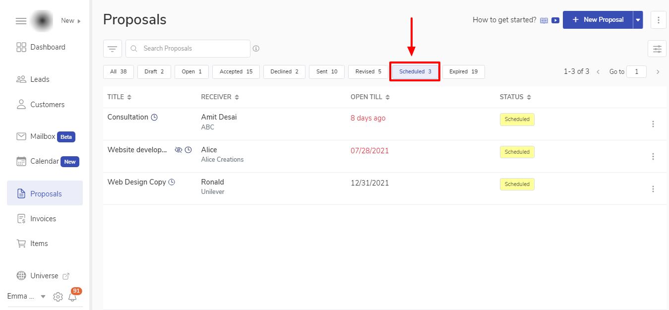 You can apply the filter by selecting scheduled and you will be able to see all the proposals which are scheduled.