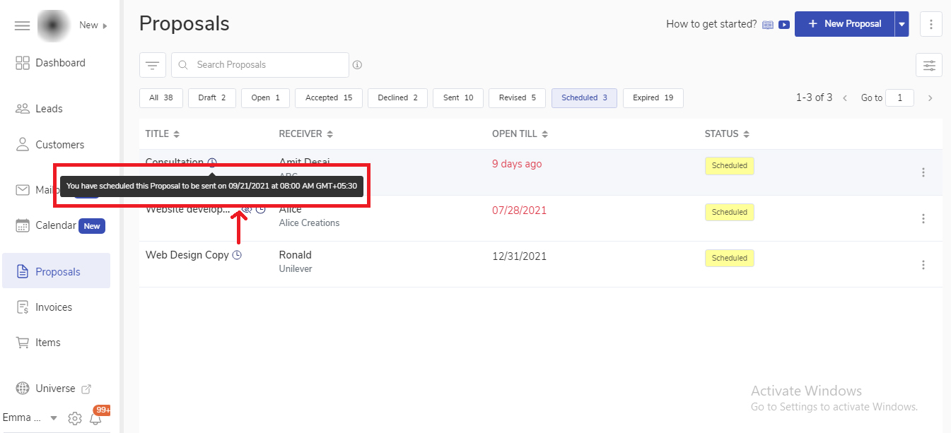 You can hover over the clock icon to check the date and time of the scheduled Proposals