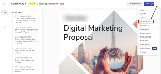 To reschedule your Proposal, Click on the three ellipses icon and click on Reschedule email.